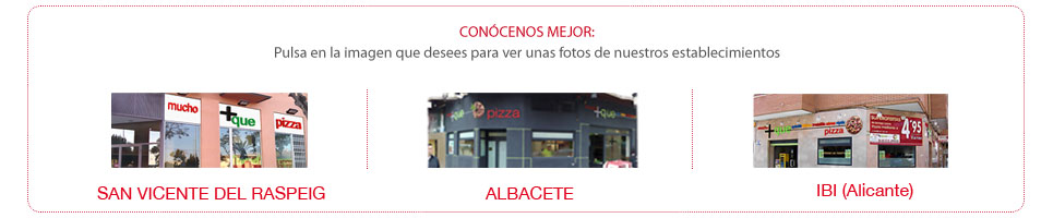 Vinculados desde el año 1994 al mundo de la pizza, y con amplia experiencia en el sector de la comida preparada, en 2010 crean su propia marca mucho+que pizza y empiezan a comercializar sus pizzas con la apertura de la tienda de Albacete, en la Plaza Mayor. También en ese año comienza a funcionar la tienda de Ibi(Alicante), ubicada en una plaza muy destacada de la localidad juguetera, la de los Reyes Magos. Recientemente, en Junio de 2012, una tercera tienda mucho+quepizza ha comenzado a funcionar de manera brillante en la localidad alicantina de San Vicente del Raspeig, muy cerca del Parque Lo Torrent y a escasos trescientos metros de las instalaciones de la Universidad de Alicante.